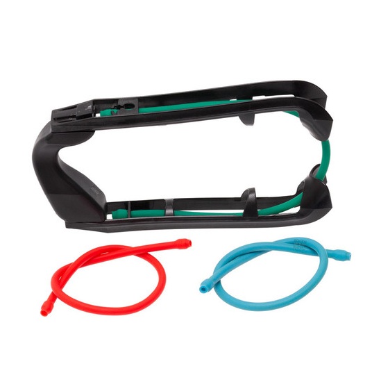 Een kracht trainings apparaat met een boog grip en drie verschillende sterktes elastiek.